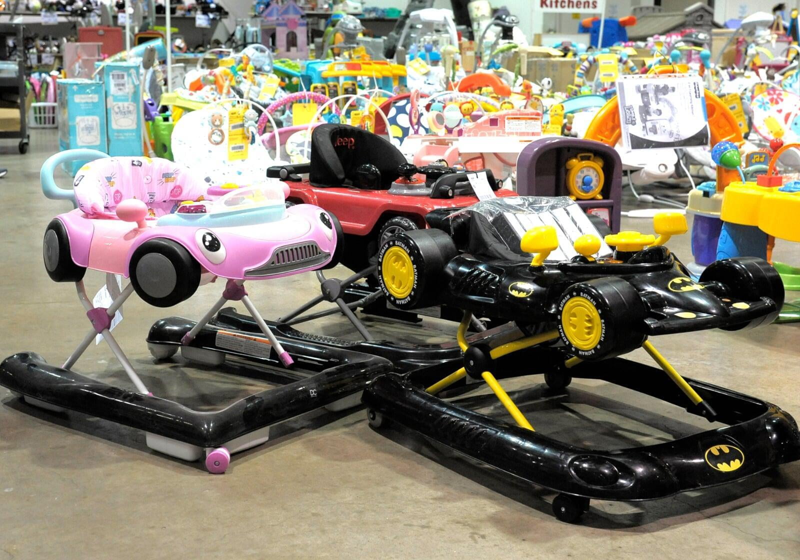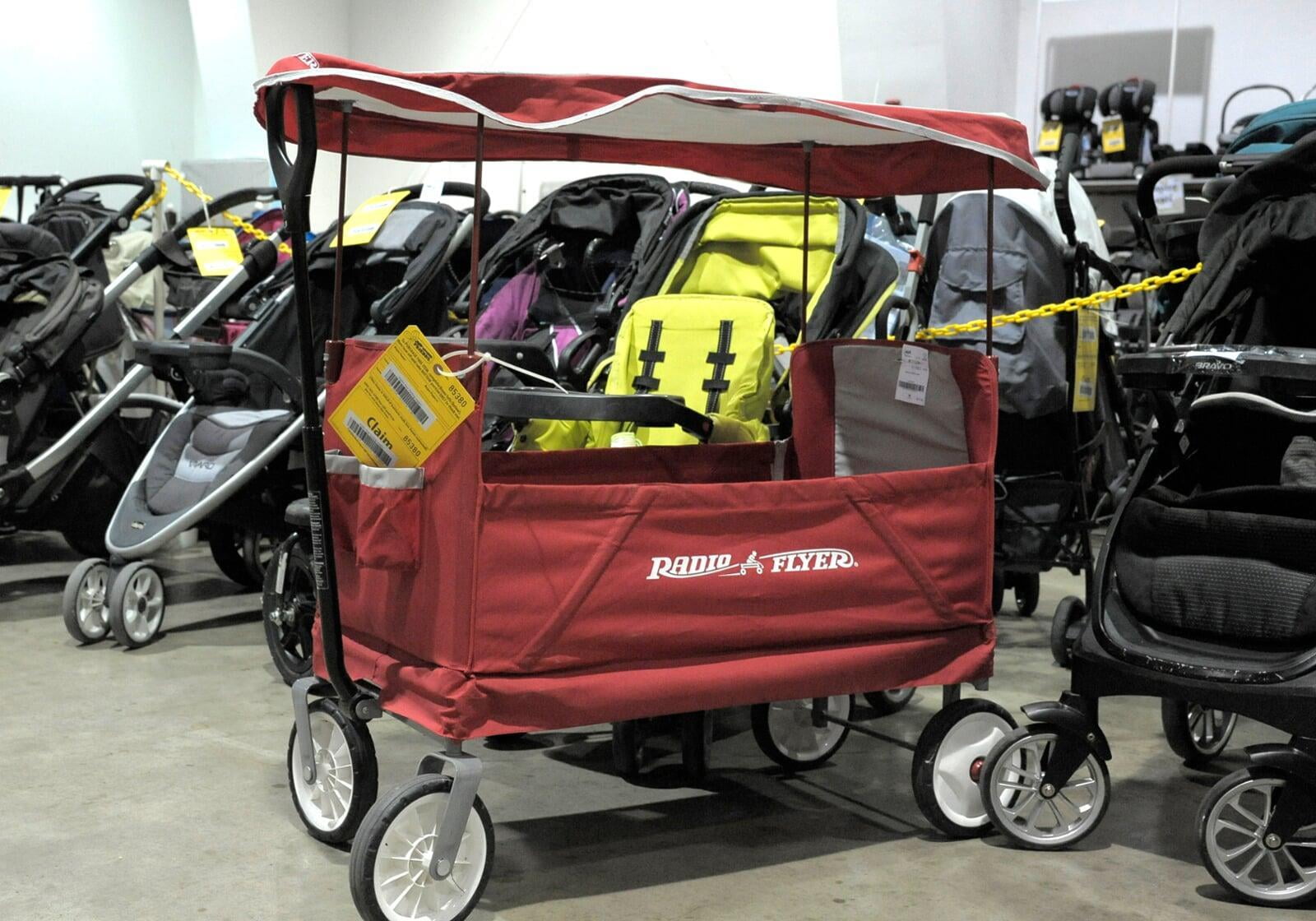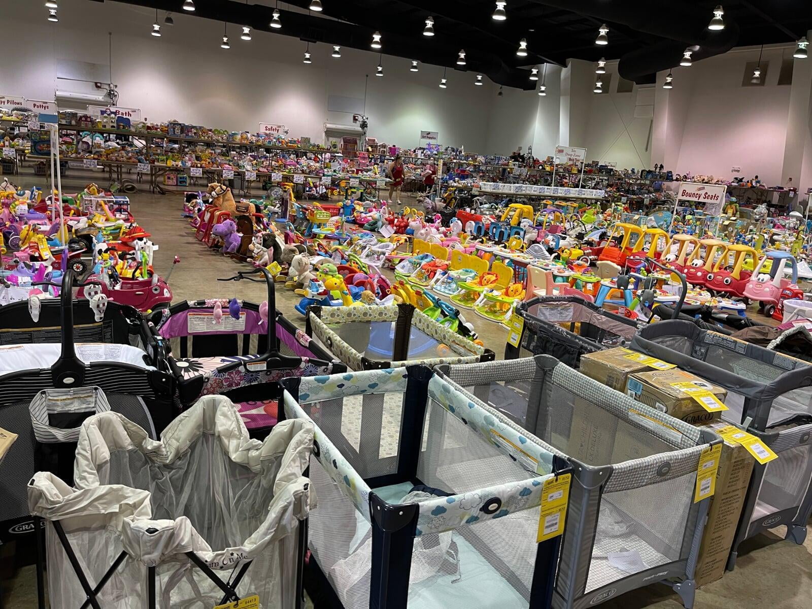 Overview of the sale showing bouncy seats and other merchandise presented.