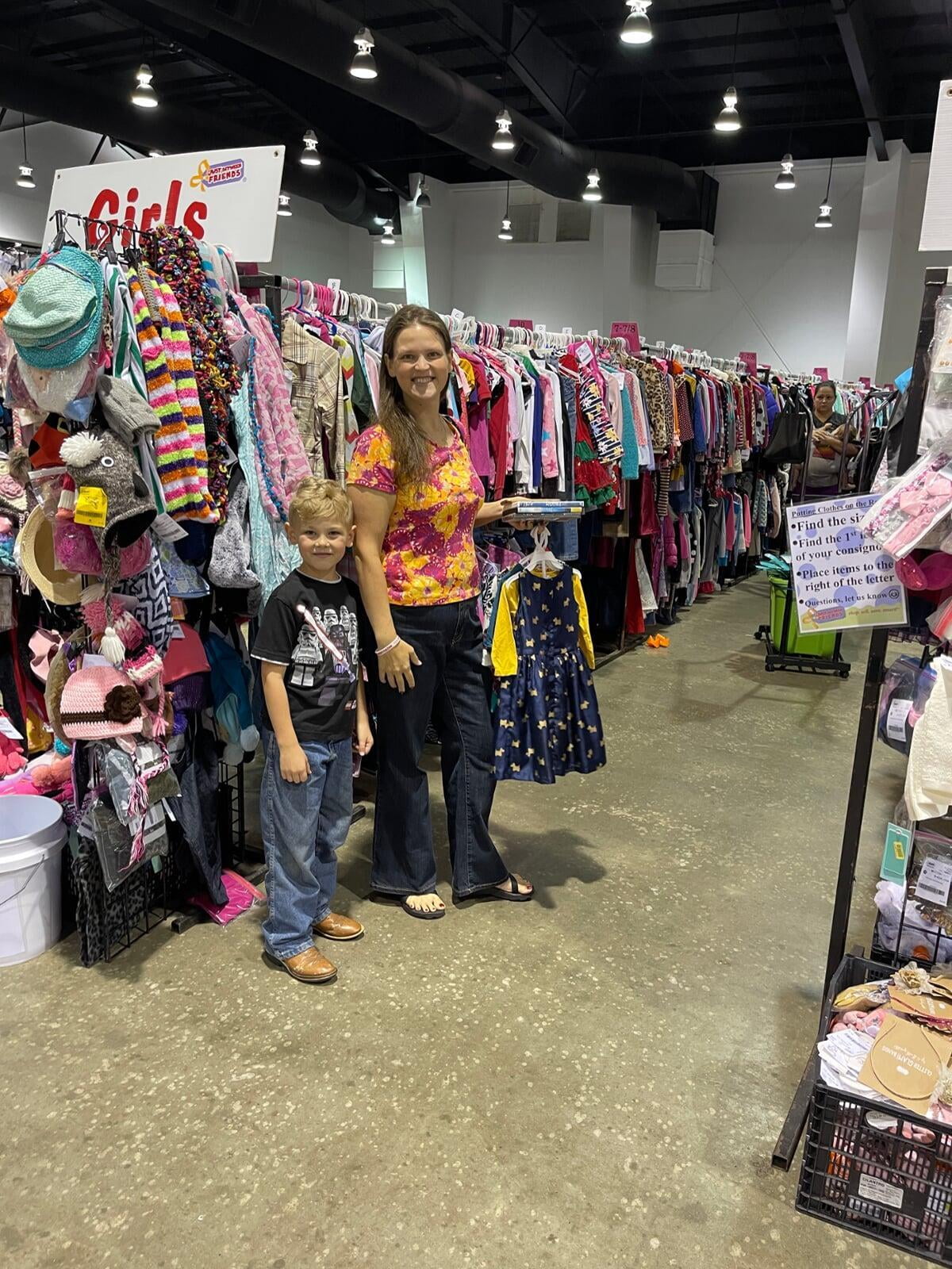 A young JBF shopper mom in a black Metallica T-shirt holds an outfit she intends to buy at her local JBF sale.